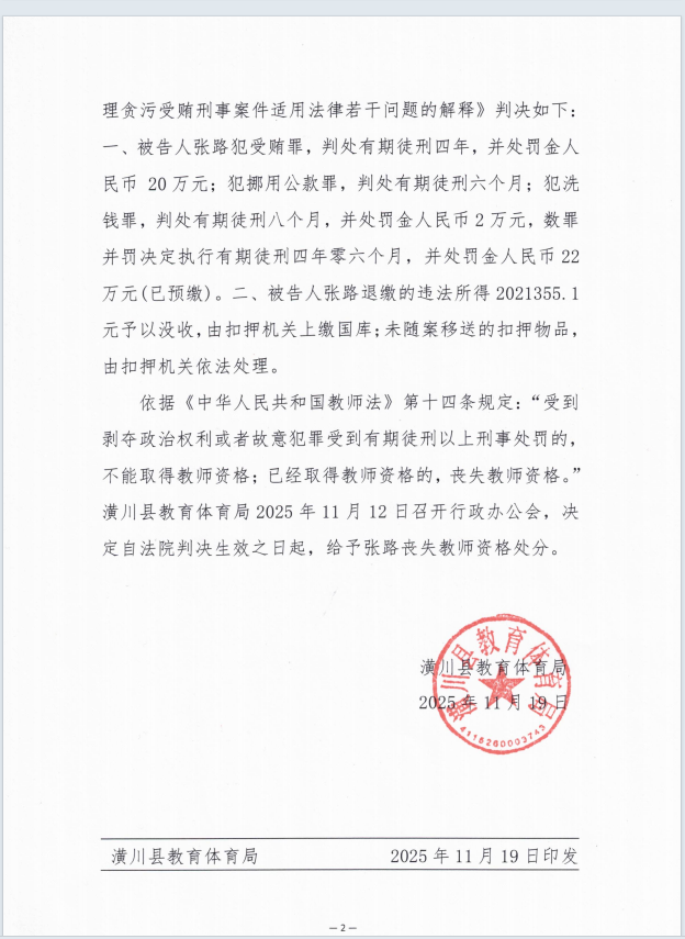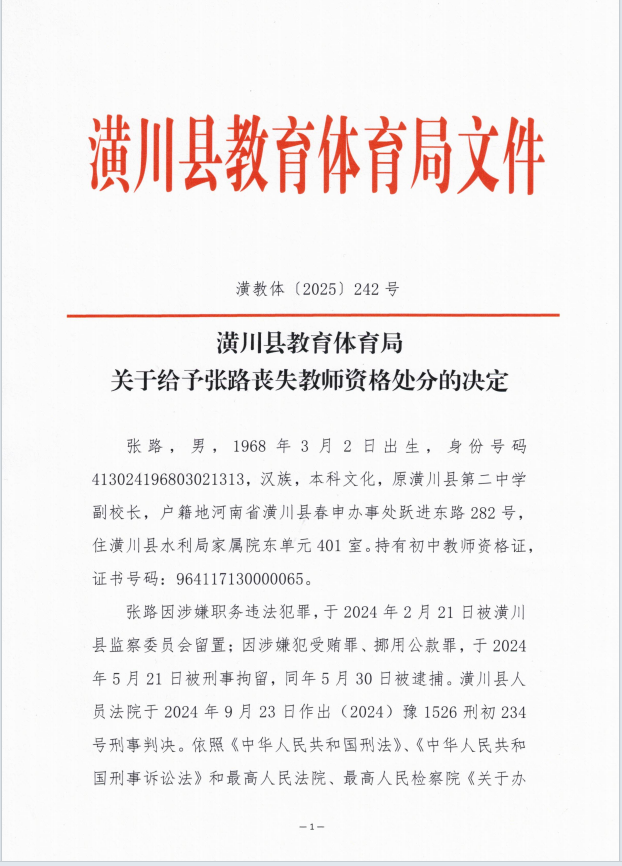潢川县教育体育局关于给予张路丧失教师资格处分的决定