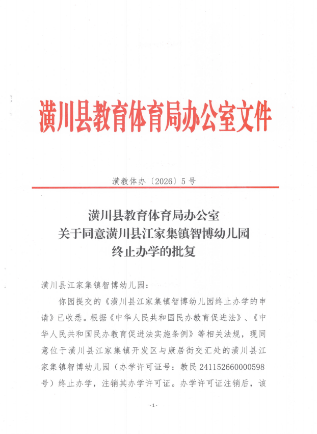 潢川县教育体育局办公室关于同意潢川县江家集镇智博幼儿园终止办学的批复