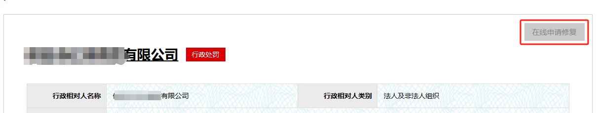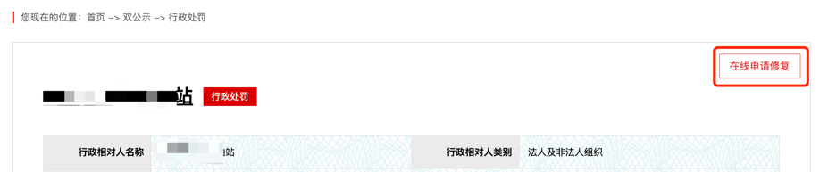 3查看行政处罚信息右上角的“在线申请修复”按钮。